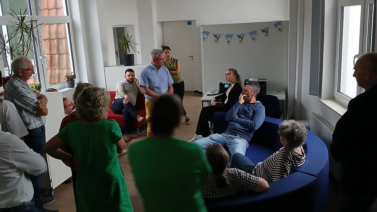 Matthias Schmitt (Mitte), stellvertretender Leiter der Gesamtschule Bad Lippspringe, zeigt den Ausschussmitgliedern auch die zwei Lehrerzimmer mit den gemütlichen Sofas. | © Uwe Müller