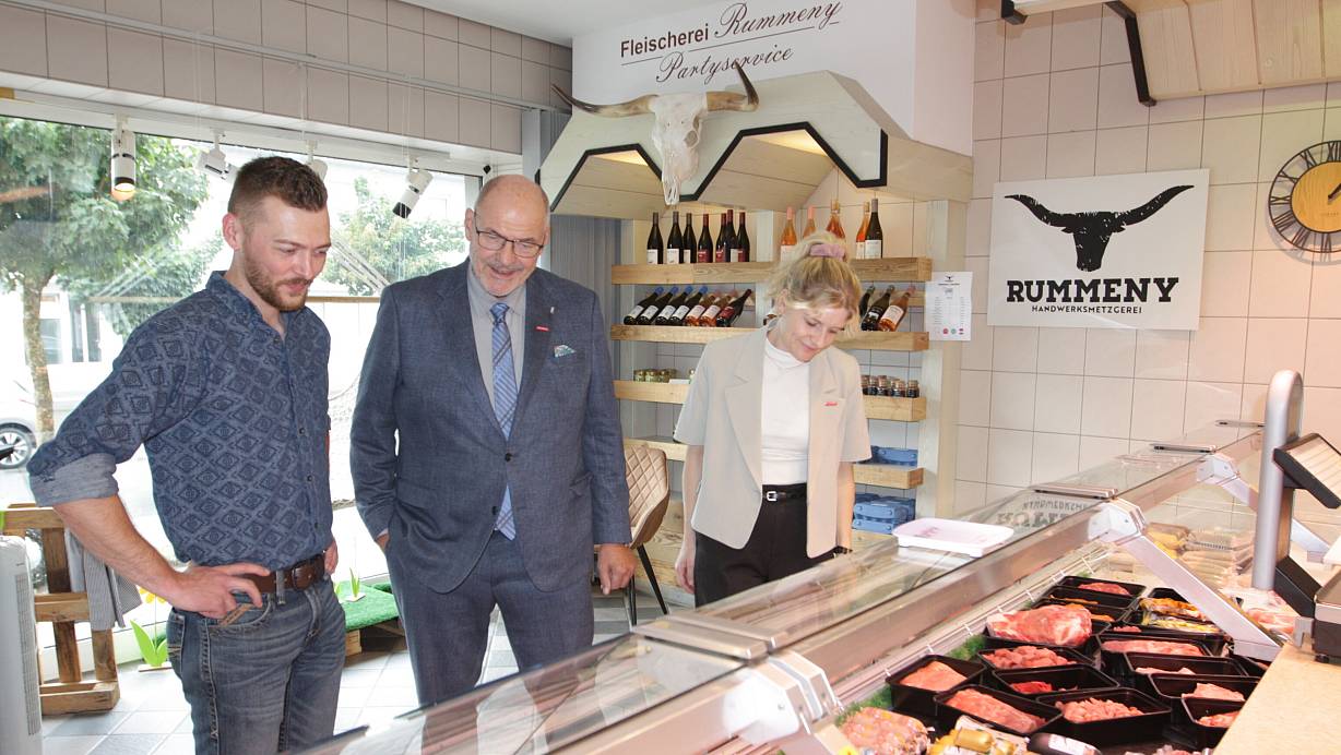Fleischermeister Nils Wüllner zeigt Peter Eul, Präsident der Handwerkskammer OWL, und Lisa Büngeler, Betriebsberaterin der Handwerkskammer, seine Produkte in der Bad Lippspringer Metzgerei Rummeny. | © Uwe Müller