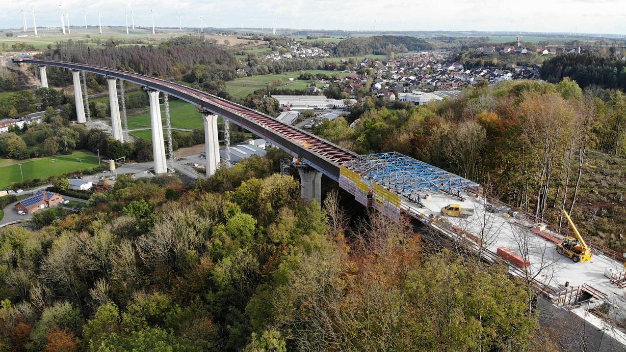 Auf dem Aftetal-Bauwerk für die Ortsumgehung B 480n haben die Arbeiten am Fahrbahnuntergrund begonnen. Ein besonderer Plan sorgt dafür, dass die Stabilität der Trasse in 70 Metern Höhe gewährleistet ist