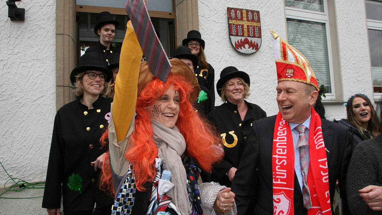 Und nach einer kleinen Büttenrede von Ruth Klaaßen vom Weiberfastnachtsgremium, in der die Inhaberin der Gaststätte Vesperthe noch einmal deutlich machte, dass Fürstenberg nach dem dreiteiligen Beschluss aus dem Jahr 1972 Verwaltungssitz ist und bleibt, musste nicht nur das Rathaus, sondern auch der Schlips vom Bürgermeister dran glauben. Beides sorgte für entsprechenden Jubel. Und Klaaßen freute sich über eine weitere Trophäe an Weiberfastnacht.