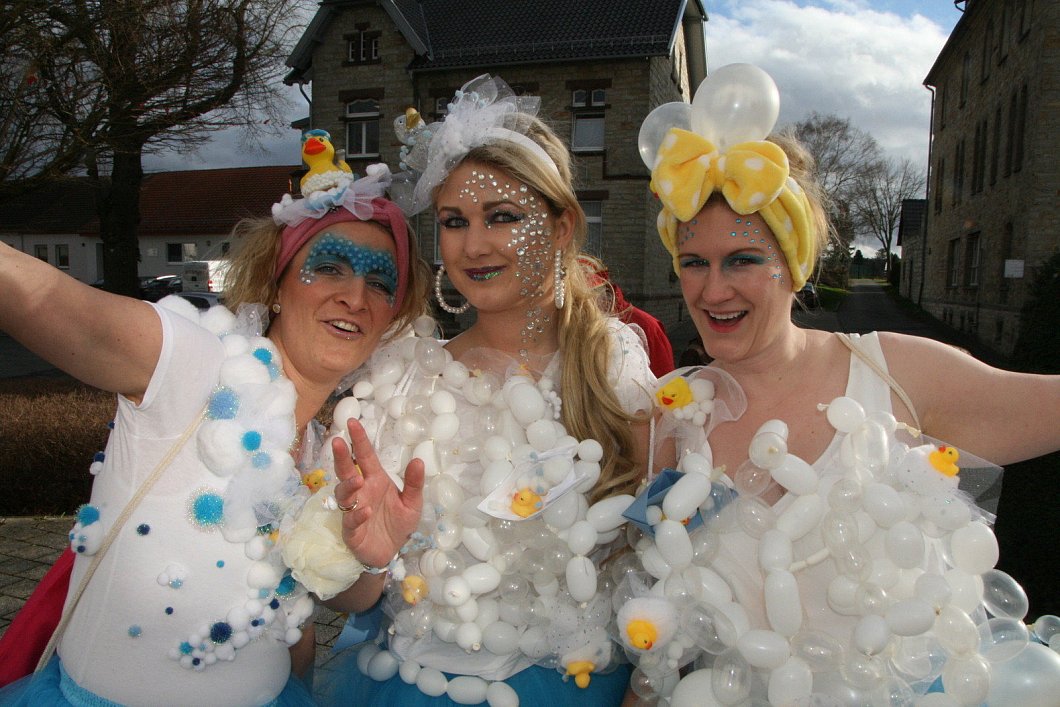 Eine der vielen jecken Frauen war Julia Klimeck. Die junge Mutter hatte ihre dreimonatige Tochter Nele als Popcorntüte verkleidet, entsprechend dick verpackt war die Kleine. „Ich habe immer gesagt, wenn ich ein Mädchen bekomme, geht es an Weiberfastnacht als Popcorntüte", so die junge Frau. Warum sie beim Karneval mitmacht? „Ich komme aus Fürstenberg", sagt sie, „ich bin mit dem Karneval aufgewachsen, der gehört für mich einfach dazu", erzählt Julia Klimeck.