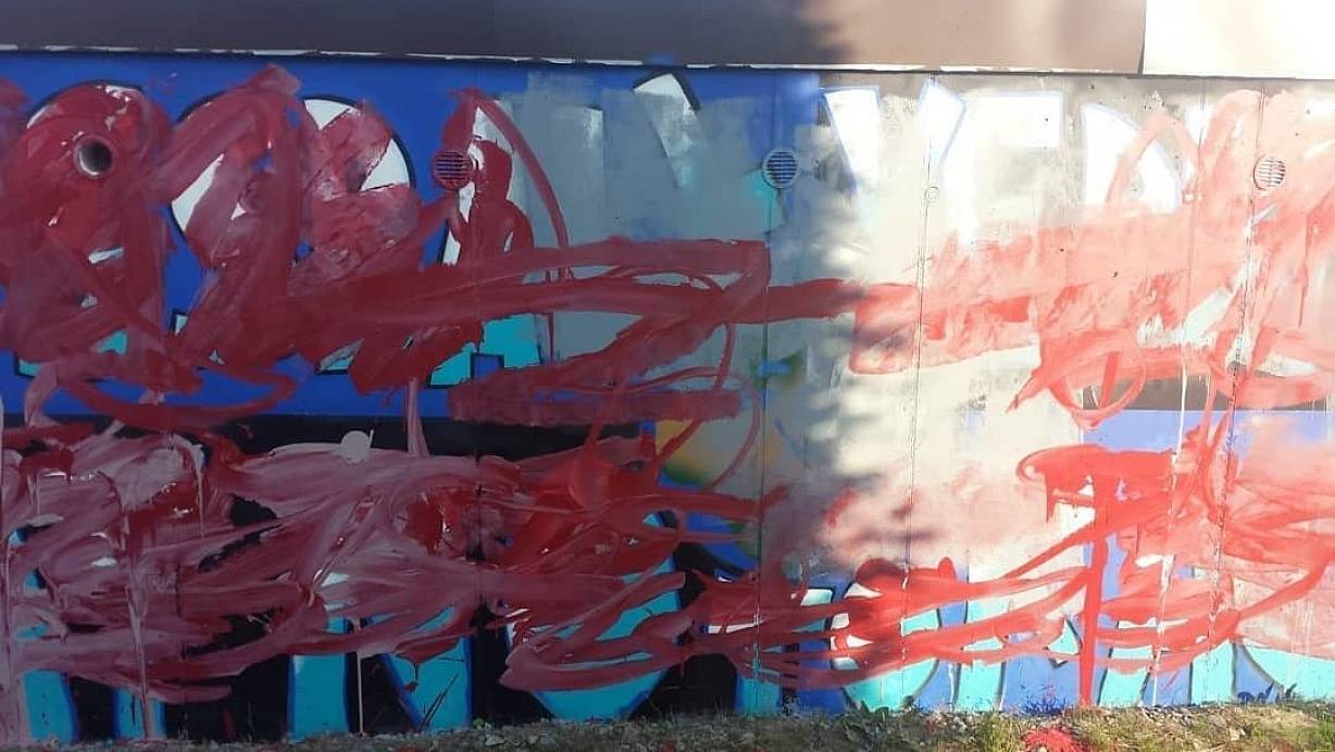 In der Nacht von Montag auf Dienstag beschmierten bisher unbekannte Täter das Graffito mit roter Farbe. | © FSV Bad Wünnenberg