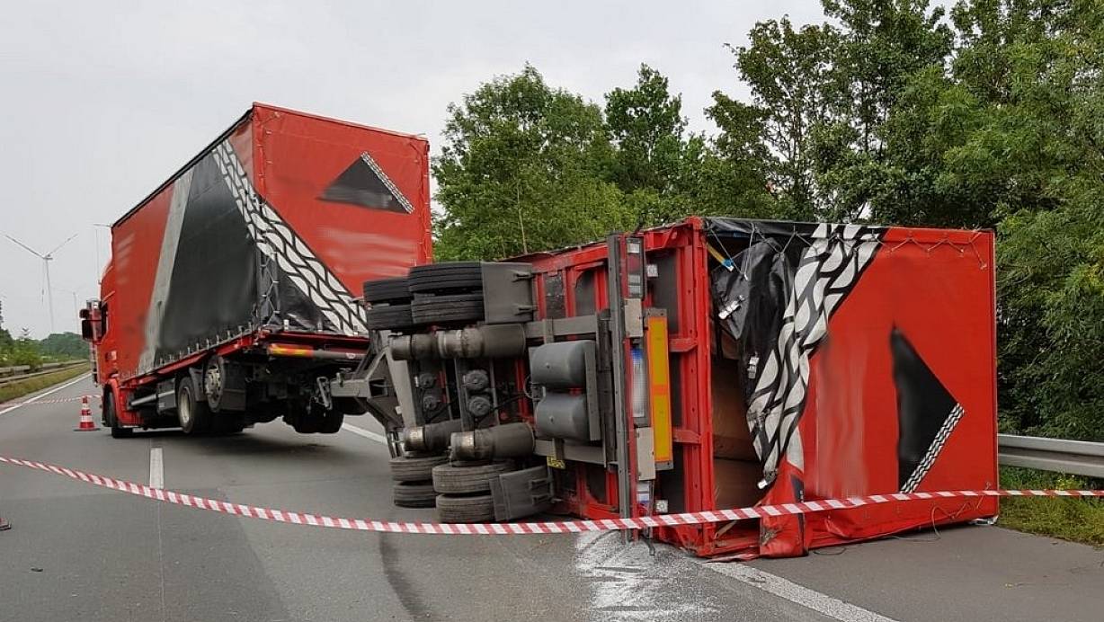Das Gespann war mit der Leitplanke kollidiert und der Anhänger stürzte daraufhin auf die Seite. Dadurch blockierte er beide Fahrbahnen fast komplett. Beide Insassen des LKW wurden notärztlich untersucht, waren aber unverletzt geblieben.