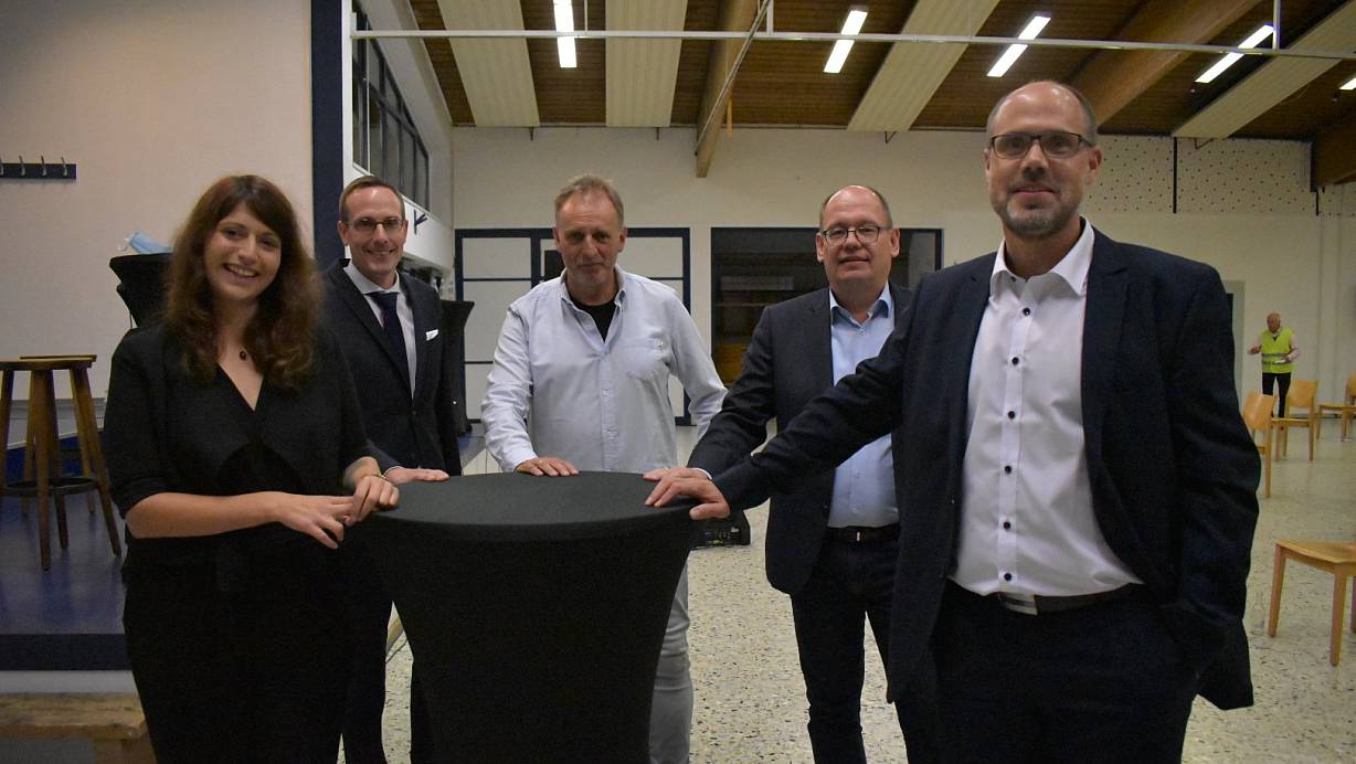 Bei der Diskussion zur Bürgermeisterwahl, moderiert von Gisbert Henkel (Mitte), präsentierten (v.l.) Nadine Dubberke (Bündnis 90/Die Grünen), Ingmar Reisige (FDP), Stefan Stachowiak (SPD) und Christian Carl (CDU) ihre Vorstellungen. | © Julia Stratmann