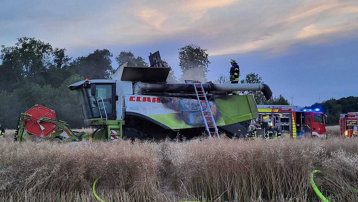 Das Erntegerät ist auf einem Rapsfeld im Einsatz.