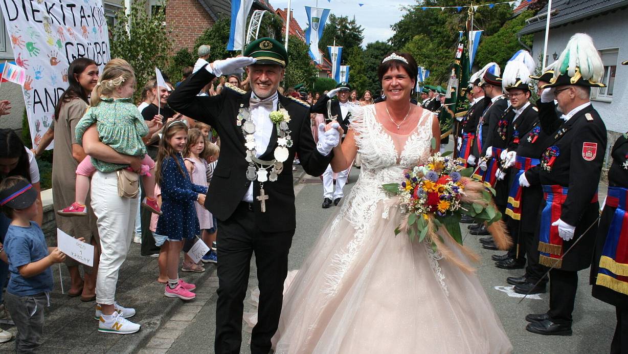 Die Häuser waren beflaggt und die Menschen standen am Nachmittag beim großen Festumzug reihenweise Spalier. Ziel des Schützentrosses war zunächst der Wohnsitz von Udo und Andrea Fels in der Siedlung Am Walde 7. Hier angekommen, begrüßte Schützenoberst Heinrich Feldmann das Regentenpaar.