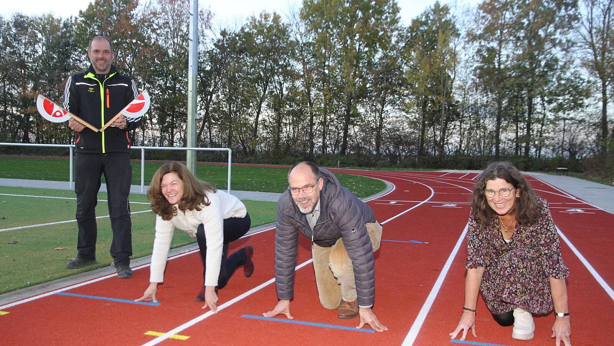 Antrittsschnell und spurtstark: die Vorsitzende des Ausschusses für Familie, Jugend, Sport und Kultur, Sabine Willeke, Bürgermeister Christian Carl und Schulleiterin Irmhild Jakobi-Reike, probieren die neue Tartanbahn gleich mal aus. | © Johannes Büttner