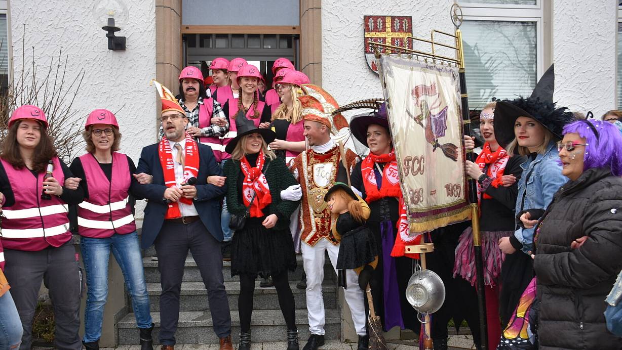 Bei bester Stimmung feierten mit viel Musik Bürgermeister Christian Carl, die drei Oberhexen Isabella Jakobi, Britta Broer, Saskia Volmert und FCC-Prinz Janis I. Lange mit dem ausgelassenen Narrenvolk. | © Brigitta Wieskotten