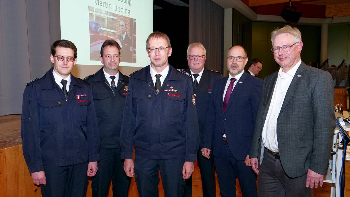 Offiziell von der Feuerwehr verabschiedet wurde Wehrführer Martin Liebing (3. v. l.). Dank und Anerkennung zollten (v. l.) Andreas Luig, Marcus Siekaup, Elmar Keuter, Christian Carl und Jörg Schlüter. | © Ralph Meyer