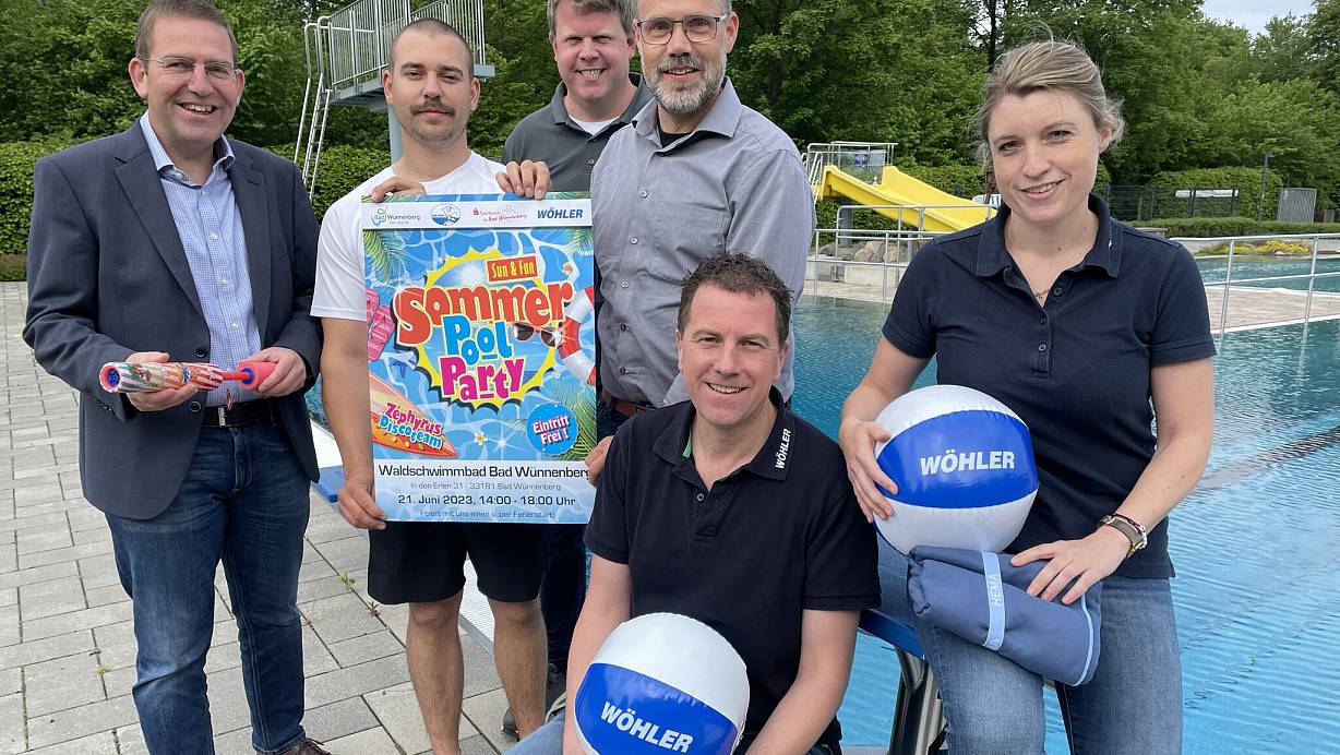Dirk Herbst (Sparkasse, v. l.), Steffen Willeke (Waldschwimmbad), Frank Zeisberg (DLRG Bad Wünnenberg), Bürgermeister Christian Carl, Christian Beyerstedt und Julia Besse (beide Wöhler) freuen sich auf Sommer, Sonne und Party im Waldschwimmbad. | © Stadt Bad Wünnenberg