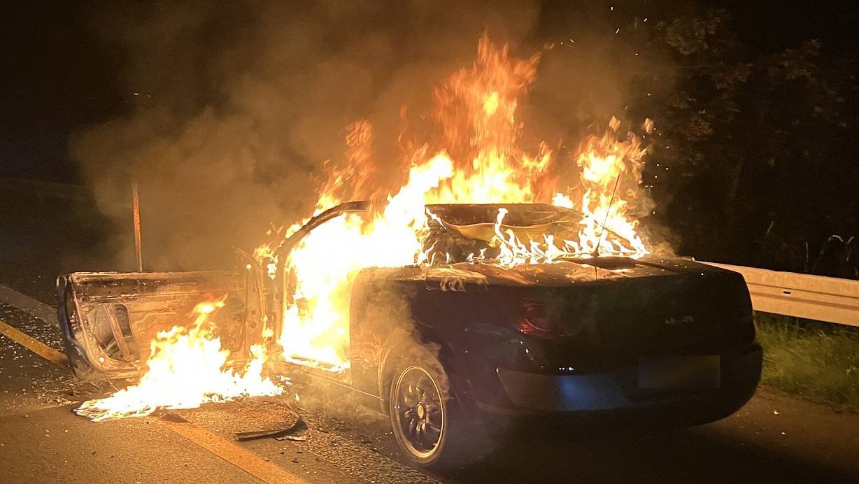 Bei Eintreffen der ersten Einsatzkräfte stand der PKW auf der A44 bereits vollständig in Flammen. | © Feuerwehr Bad Wünnenberg