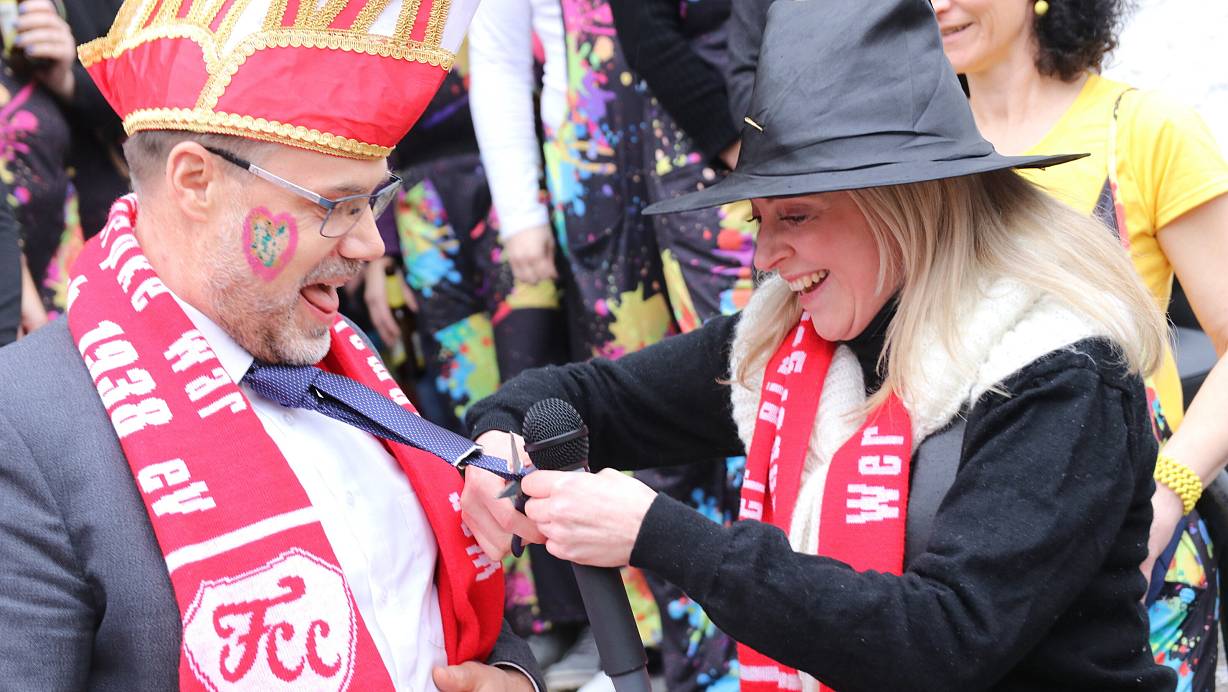 Oberhexe Isabella Jakoby kürzt Bürgermeister Christian Carl die Krawatte. | © Alina Rullkötter