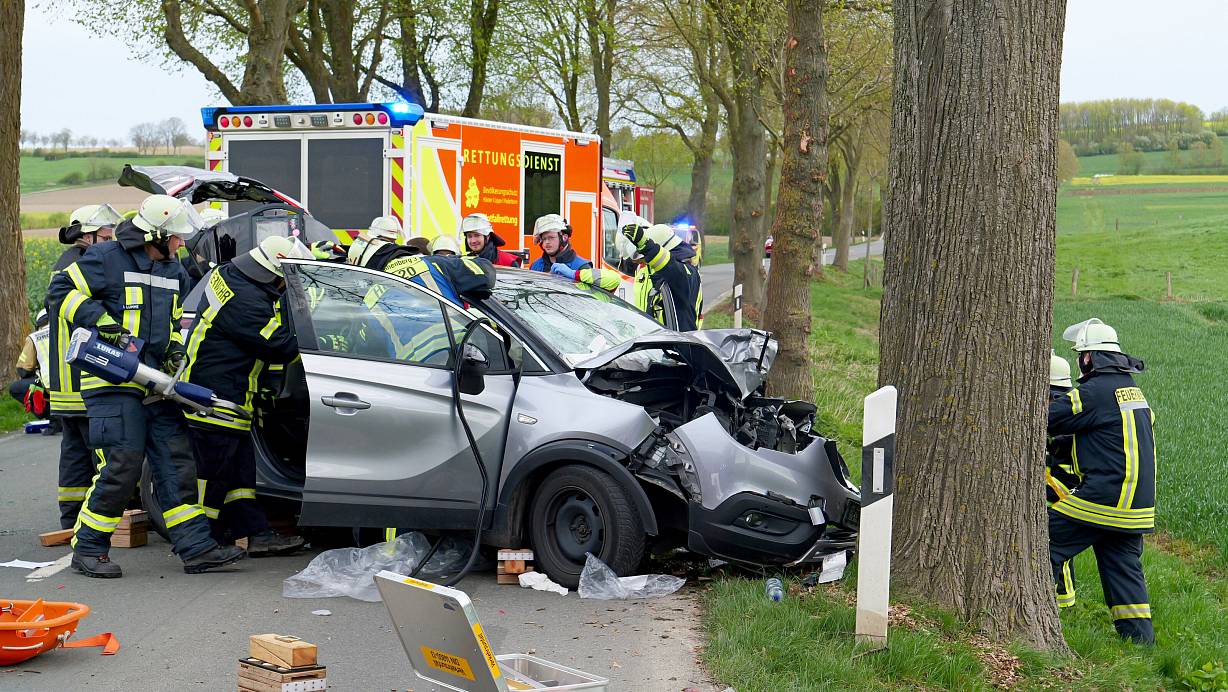 Die Feuerwehr Bad Wünnenberg muss die beiden schwer verletzten Insassen mit hydraulischen Werkzeugen aus dem zerstörten Pkw befreien.