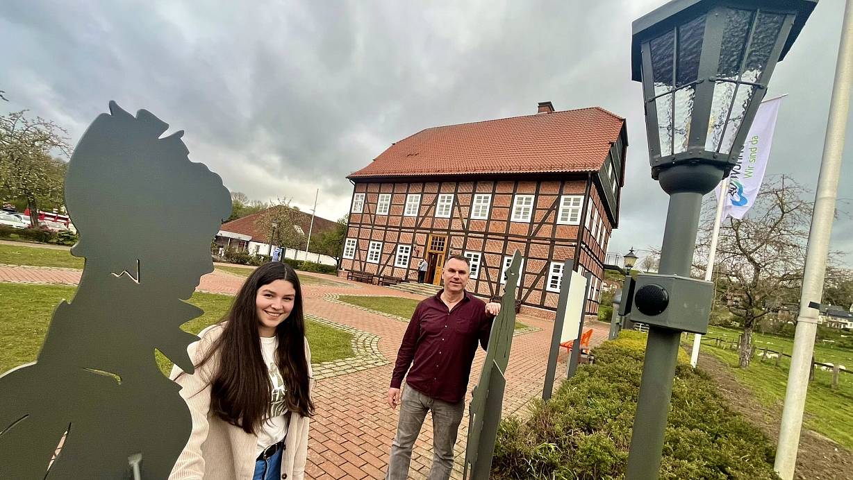 Marie und Jörg Bettermann haben zwei besonderen Figuren vor dem Spanckenhof ihre Stimmen geliehen. Die früheren Bewohner laden zum Besuch des Museums im Inneren des Gebäudes ein. | © Jens Reddeker