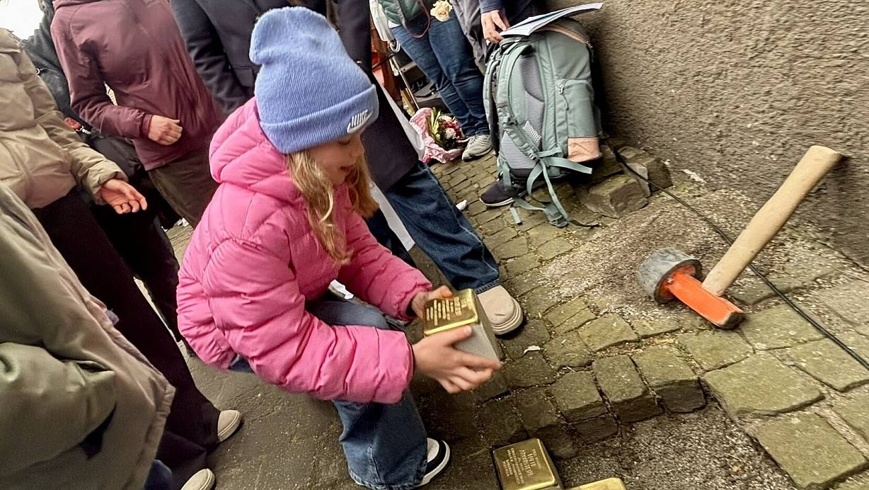 Auch Grundschülerin Edda Schäfer darf einen der Stolpersteine für die während des Nazi-Regimes vertriebene Wünnenberger Familie Aronstein in der Mittelstraße verlegen. | © Jens Reddeker