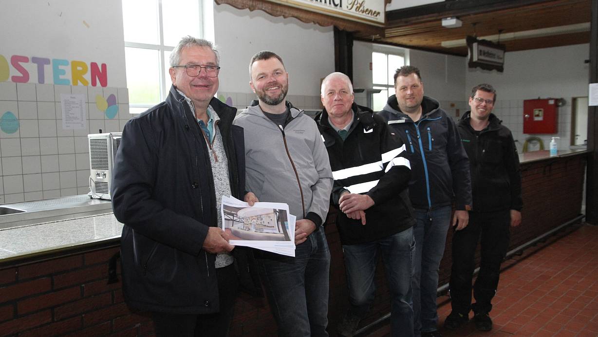 Der Schützenvorstand mit Andreas Veith (v. l.), Matthias Sprenger, Bauleiter Christian Hesse, Patrick Hermann und Matthias Kramps hat viel vor in der Schützenhalle. | © Johannes Büttner