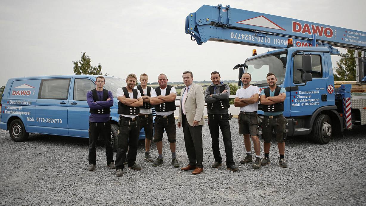 Borchen. Morgens um 7.30 Uhr fand sich der Borchener Bürgermeister Reiner Allerdissen bei der Firma Dawo im Borchener Gewerbegebiet zum Kennenlernen des Unternehmens ein. Dem Bürgermeister präsentierte sich eine Firma, die sich schon seit vielen Jahren auf dem Gebiet der Dachdeckerei, der Zimmerei und des Gerüstbaus einen hervorragenden Namen gemacht hat. Wie die Geschäftsführer - Herr Wasem, Herr Klassen und Herr Jung - mitteilten, erwarb das Unternehmen inzwischen auch Erfahrungen mit dem Bau von Eigenheimen in Holzständerbauweise. Gern würde man diesen Bereich in Zukunft weiter forcieren. Sieben Facharbeiter gewährleisten die entsprechende Qualität. Foto: Thomas Finke