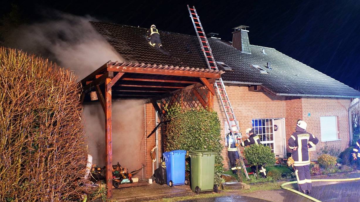 Der Brand im Bereich des Carports, unter dem ein Wohnwagen stand, wurde gegen 22.10 Uhr von Anwohnern bemerkt, die auch die Feuerwehr alarmierten. Aufgrund des starken Windes breitete sich das Feuer schnell aus und griff auf einen weiteren Anhänger vor dem Carport und das Wohnhaus über. Der Wohnwagen brannte völlig aus. Die Fassade des Wohnhauses sowie das Dach wurden stark beschädigt. Ein Zimmer brannte komplett aus. Der Carport und ein weiterer Anhänger wurden stark beschädigt. Der Schaden wird auf insgesamt 150.000 Euro geschätzt.