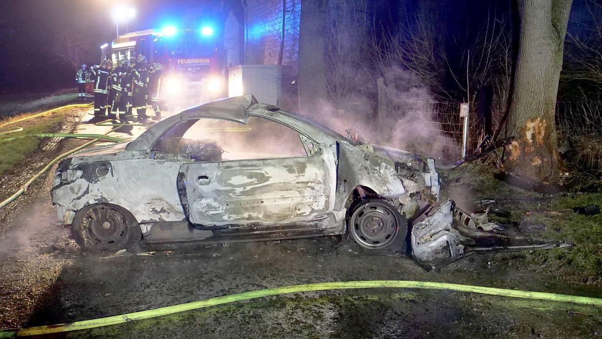 Nach dem Anprall gegen den Straßenbaum ging der Peugeot in Flammen auf und brannte vollständig aus. Der mutmaßlich verletzte Fahrer flüchtete in die Feldflur. | © Ralph Meyer