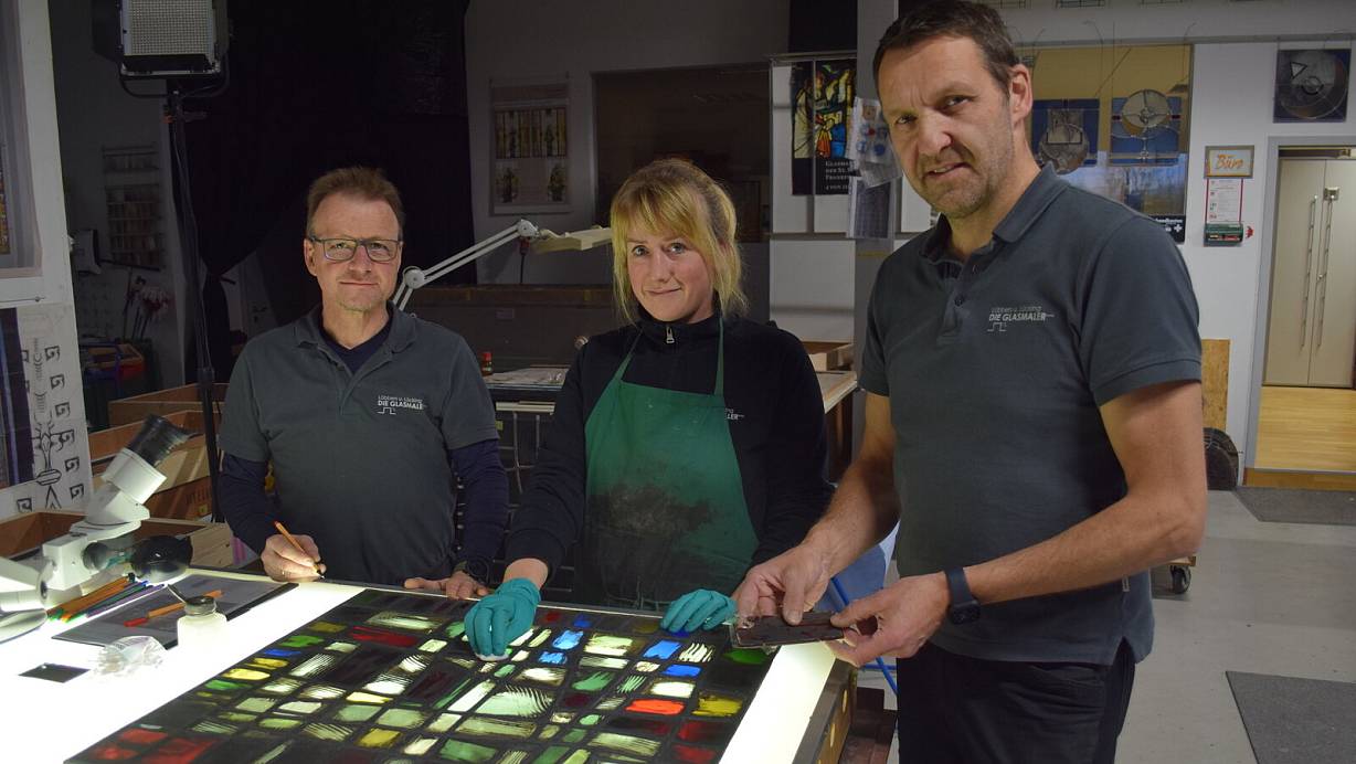 Echte Handwerkskunst: Ann Kathrin Striewe säubert gerade ein Glaselement, welches zu einem der Fenster aus Notre-Dame gehört. Die Glasmalerei GmbH von Stephan Lübbers (l.) und Stefan Lücking (r.) restauriert in Borchen derzeit zwei Fenster aus der weltweit bekannten französischen Kathedrale. | © Mark Heinemann