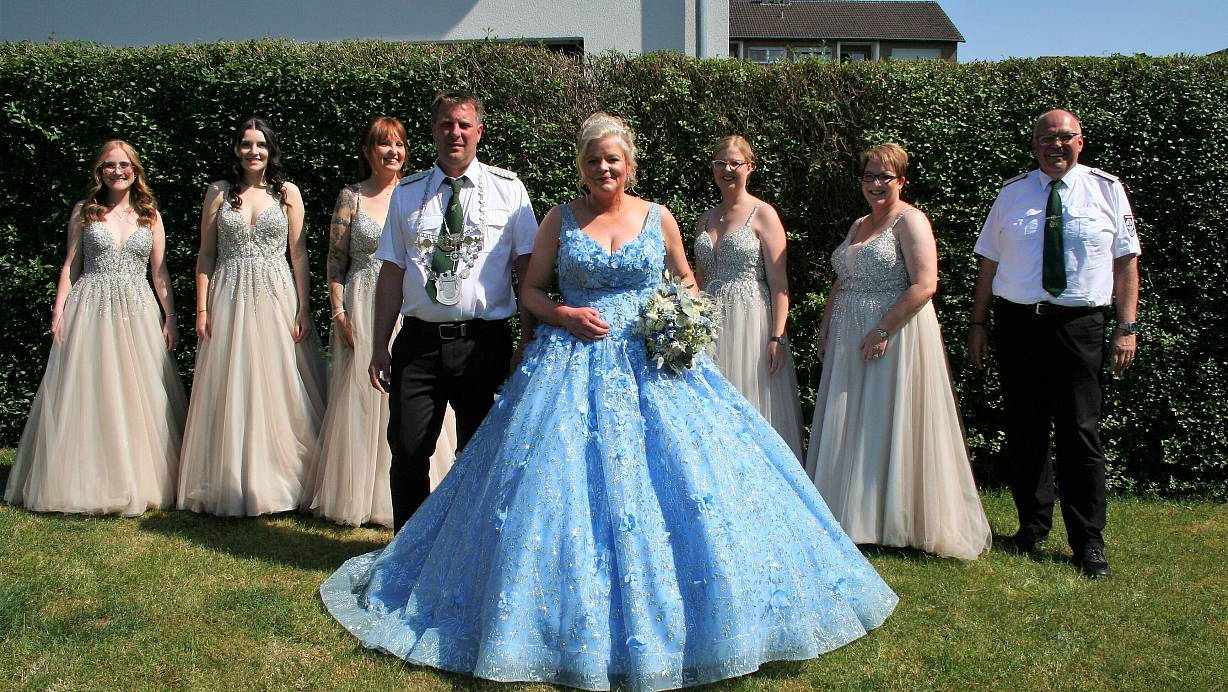 Das Königspaar Tanja Voss-Vonnahme und König Rene Voss feiert mit den Hofdamen Daniela Holtz, Kim-Marie Rex, Karina Roggel, Andrea Bittermann und Svea Ott. Zeremonienmeister Frank Rakowski steht auch immer parat. | © Johannes Büttner