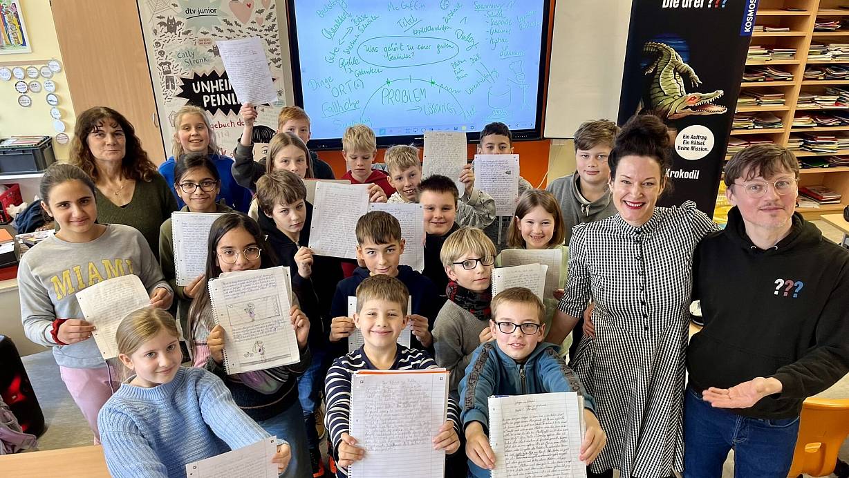 Die Nachwuchs-Autoren der 5b um Klassenlehrerin Heike Zenner (l.) zeigen ihre Werke nach dem Workshop mit Cally Stronk und Christian Friedrich (r.). Auf der digitalen Tafel im Hintergrund ist eine Stichwortsammlung zu finden, die in der Klasse erarbeitet worden ist. | © Jens Reddeker