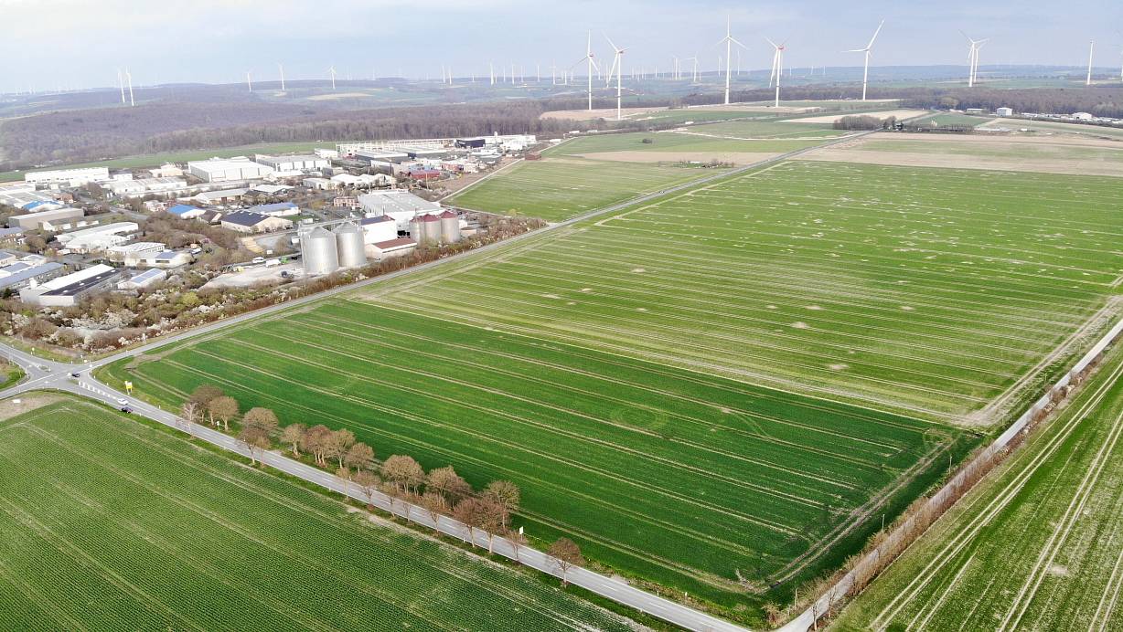 Die große rechteckige Ackerfläche zwischen Judenweg (im Vordergrund) und der kreuzenden Straße Am Kleeberg ist im Regionalplan als Gewerbezone ausgewiesen. Direkt nebenan ist das Borchener Gewerbegebiet zu sehen. Dahinter verläuft die A33. | © Jens Reddeker