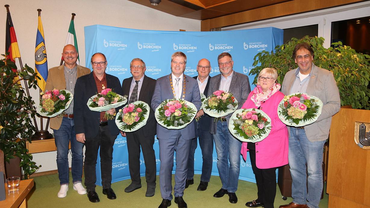 Alexander Woltersdorf (v.l.), Udo Brockpähler, Konrad Hansmeier, Uwe Gockel, Manfred Melcher, Gerald Klocke, Kornelia Wegener und Hartmut Oster wurden mit Blumensträußen und Applaus in ihre Ämter eingeführt. | © Jochem Schulze