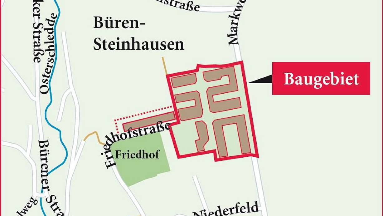 Büren-Steinhausen. Um die Grundstückspolitik in Steinhausen in Bewegung zu bringen, stellte die Stadt Büren in den Jahren 2005/06 den riesigen Bebauungsplan Oberfeld (12 Hektar) auf - mit begrenztem Erfolg. 15 Grundstücke wurden bis heute verkauft. Anstatt hier weitere Erschließungen vorzunehmen, hat die Stadt Büren den Bebauungsplan Niederfeld neu in Angriff genommen.