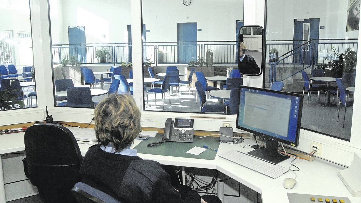 Gelegenheit für Gespräche: Aufsichtspersonal hat die Sitzgruppen im Besucherraum der Einrichtung immer im Blick, sogar per Rückspiegel. | © Reinhard Peters