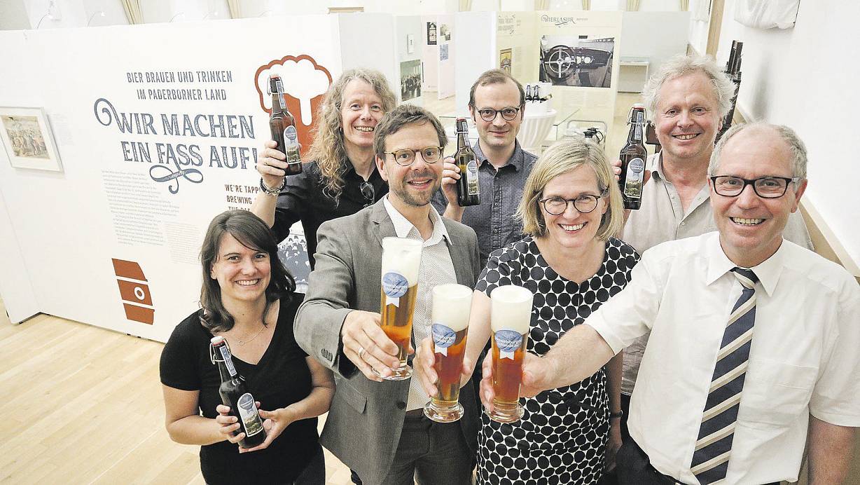 Auf die neue Ausstellung: Das Team des Kreismuseums mit (v. l.) Frauke Pixberg, Jörg Piron, Andreas Weiß (stellvertretender Museumsleiter), Erik Beck, Kirsten John-Stucke (Museumsleiterin) und Markus Moors stößt mit Landrat Manfred Müller an. Natürlich mit dem gerade eingetroffenen obergärigen "Wewelsburger Schlossbräu". | © Jens Reddeker