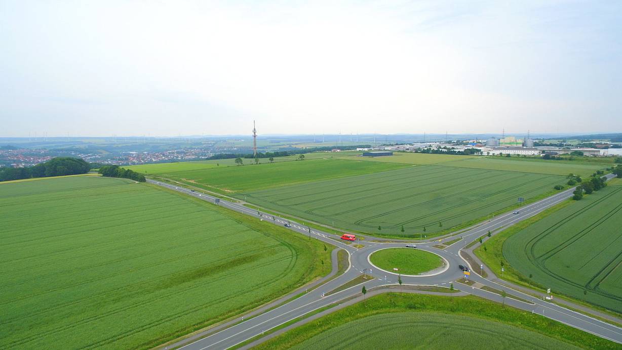 Noch eine große Ackerfläche neben dem Industriegebiet West: Am so genannten Hellweg, wo der Kreisel in Richtung Büren (links oben), Paderborn (links) und Steinhausen (unten) sowie Rüthen (rechts) leitet, will der Stadtrat die Planungen der Fläche Richtung Funkturm beschließen. | © Jens Reddeker
