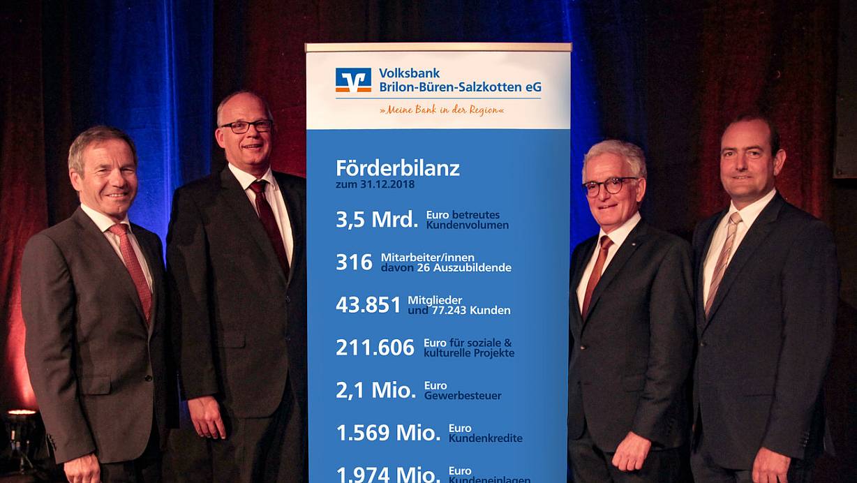 Salzkotten/Büren. Die Volksbank Brilon-Büren-Salzkotten blickt auf ein erfolgreiches Jahr 2018 zurück. Die wichtigsten Kennzahlen der positiven Entwicklung wurden auf der Vertreterversammlung bekannt gegeben. So erhöhte sich die Bilanzsumme der Bank um 59,9 Millionen Euro (3,6 Prozent) auf 1,71 Milliarden Euro bei 316 Mitarbeitern (27 Auszubildende). Ursächlich für das Wachstum sei vor allem das "lebhafte Kundengeschäft" gewesen, wie es in einer Mitteilung heißt. Auch das betreute Kundenanlagevolumen habe sich spürbar erhöht und belaufe sich auf 3,5 Milliarden Euro.