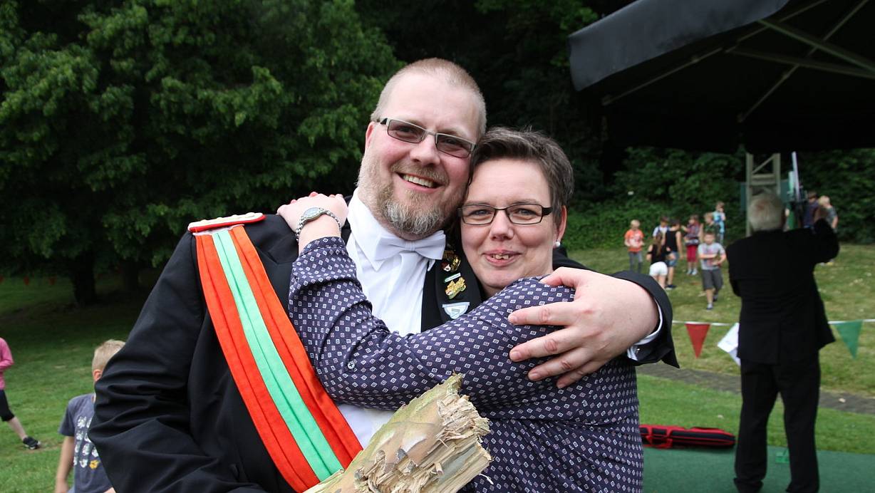 Punkt 18.32 Uhr hatte der Hauptmann der Bruderschaft den finalen Treffer gesetzt. Schuss um Schuss hatten es in der Endphase Stefan Feindt, Markus Salmen und Martin Bolzenius auf den Vogel abgegeben. Gleich nach dem Königsschuss nahm Stefan Feindt seine Frau Daniela in die Arme. Das Königspaar wohnt mit ihren Kindern Julia, Marie, Florian und Jannik an der Sebastianstraße. Neben seinen Job als Hauptmann der Sebastiöner ist Feindt aktiver Bürgerschütze, Hauptbrandmeister bei der Feuerwehr und aktives Mitglied in zahlreichen anderen Bürener Vereinen.