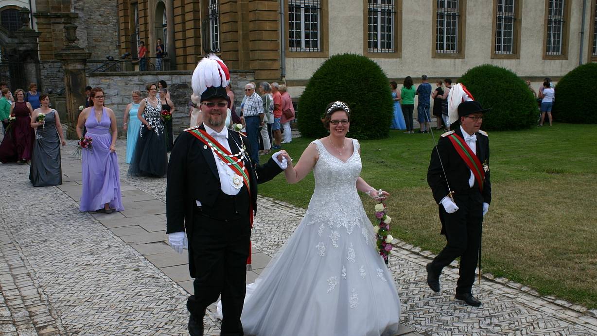 Das zufriedene Lächeln von König Stefan Feindt und der kräftige Beifall der Besucher machte schnell deutlich, dass Königin Daniela bei der Wahl ihres Kleides, trotz der Kürze der Zeit, einen echten Treffer gelandet hatte. 17 Hofdamen begleiteten das Königspaar bei ihrem Umzug durch die mit Wimpeln und Fahnen geschmückte Stadt. Ein Höhepunkt des Festumzugs in Büren ist immer der Große Zapfenstreich im Binnenhof. Die Musiker des Musikvereins Harth und das Tambourcorps Büren intonierten auch in diesem Jahr den Zapfenstreich samt Deutschlands Nationalhymne. Mit dabei war auch die Gruppe der Bruderschaft „cohors burana" in historischen Gewändern. Ihre Teilnahme war eine Referenz an ihre Mitglieder Paul und Marita Brune, die vor 25 Jahren das Königspaar der Bruderschaft waren.