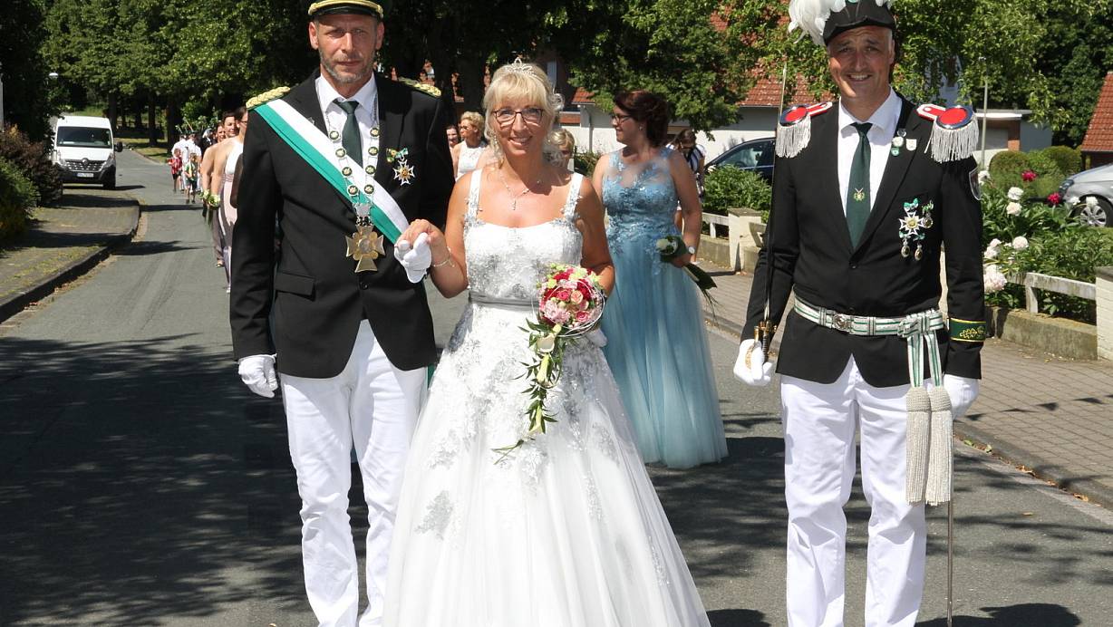 Begleitet wurde das Königspaar von 20 Hofdamen, allesamt Freunde, Bekannte, Verwandte und Kollegen des Königspaares. „Wir hatten ein wunderbares Jahr und wir danken besonders unseren Adjutanten-Paar und Berthold und Kristin Schlüter für die wunderbare Unterstützung“, sagte das Königspaar einstimmig. Bei ihrem Festzug durch Siddinghausen, an dem auch Bürgermeister Burkhard Schwuchow teilnahm, machte der Zug auch einen Stop am Kirchweg, um hier das Jubelkönigspaar Franz-Josef und Martina Hardes, die vor 25 Jahren die Schützen in Siddinghausen regierten, abzuholen.