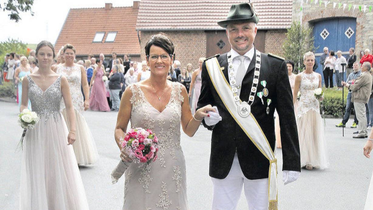 Zum Ende der Amtszeit gab es mit dem Festzug ein absolutes Highlight. Königin Anita hatte sich hierfür ein Cappuccino farbiges Kleid zugelegt, das, gepaart mit ihrem charmanten Lächeln, pure Lebensfreude zum Ausdruck brachte. Stattliche 153 Schützen begleiteten das Königspaar mit ihren 15 Hofdamen auf ihren Umzug durch das Dorf.