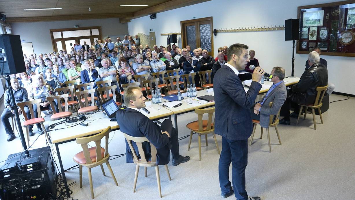 Großes Interesse: Bürgermeister Burkhard Schwuchow erläutert mit Blick auf eine Leinwand die Abläufe der kommunalen Bauleitplanung für das Vorhaben von Chefs Culinar. Die Besucher der Ahdener Bürgerversammlung und Chefs-Culinar-Geschäftsführer Christian Moll (l.) hören zu. | © Jens Reddeker