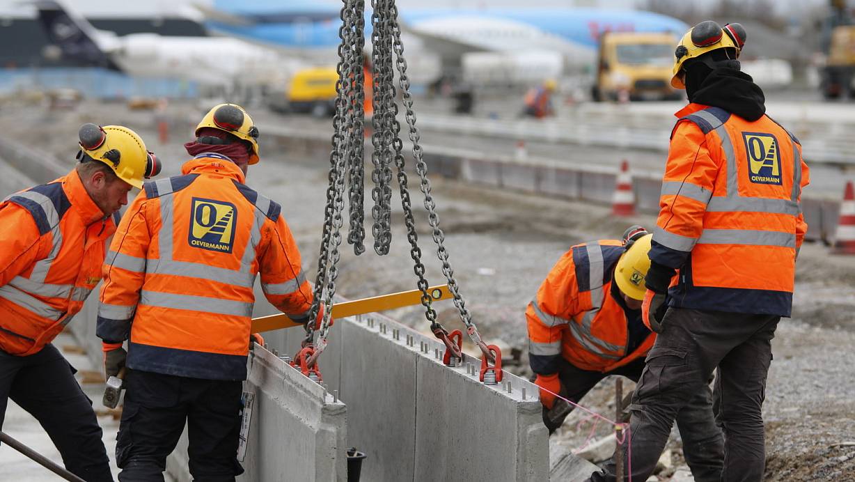 Bauarbeiter setzen momentan Betonrinnen auf das Fundament. Diese sollen später Niederschläge wie Regenwasser abführen. Zudem wird auf einer Fläche von 15.000 Quadrametern neuer Beton eingelassen. | © David Knapp
