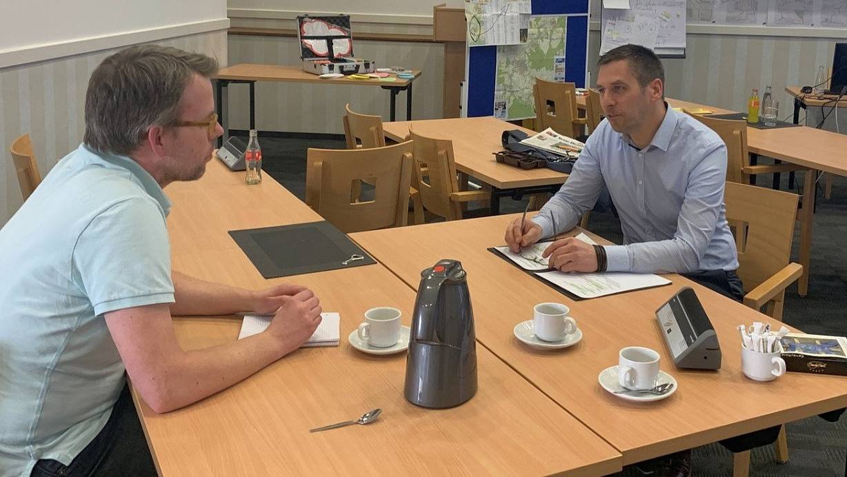 Ein Gespräch mit zwei Tischen Abstand führten Bürens Bürgermeister Burkhard Schwuchow (r.) und NW-Redakteur Jens Reddeker. | © KM