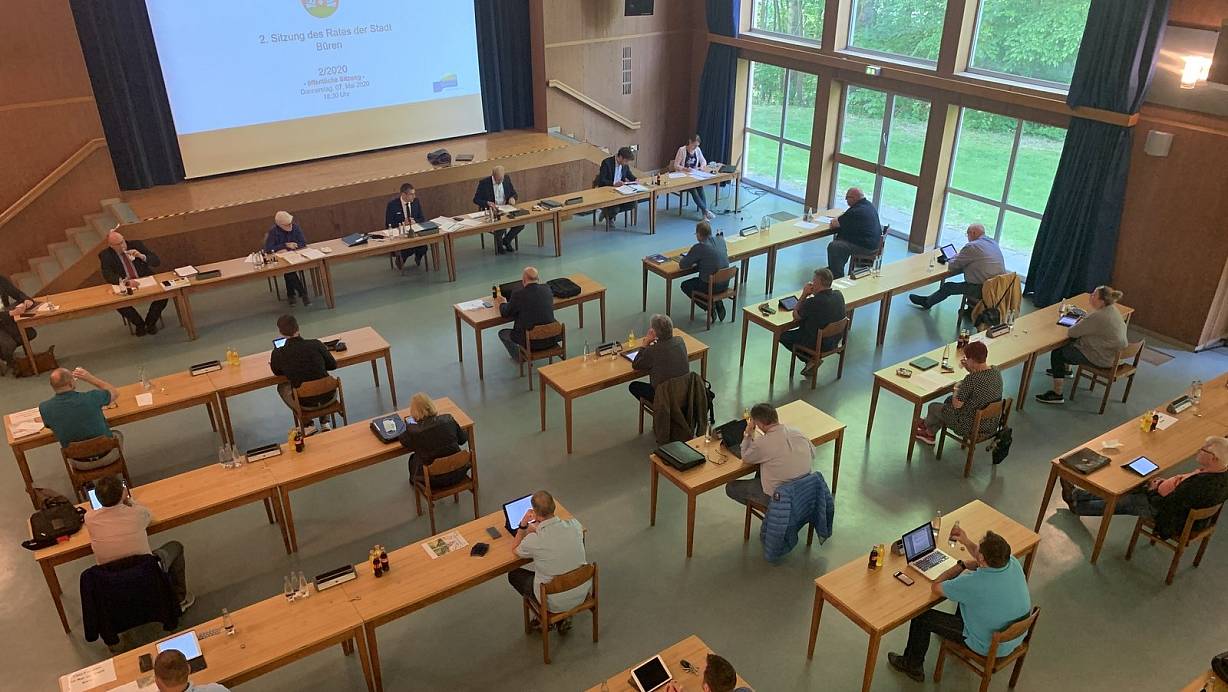 Um die Abstandsregeln einhalten zu können, tagt der Rat der Stadt Büren im Theatersaal der Stadthalle. | © Jens Reddeker