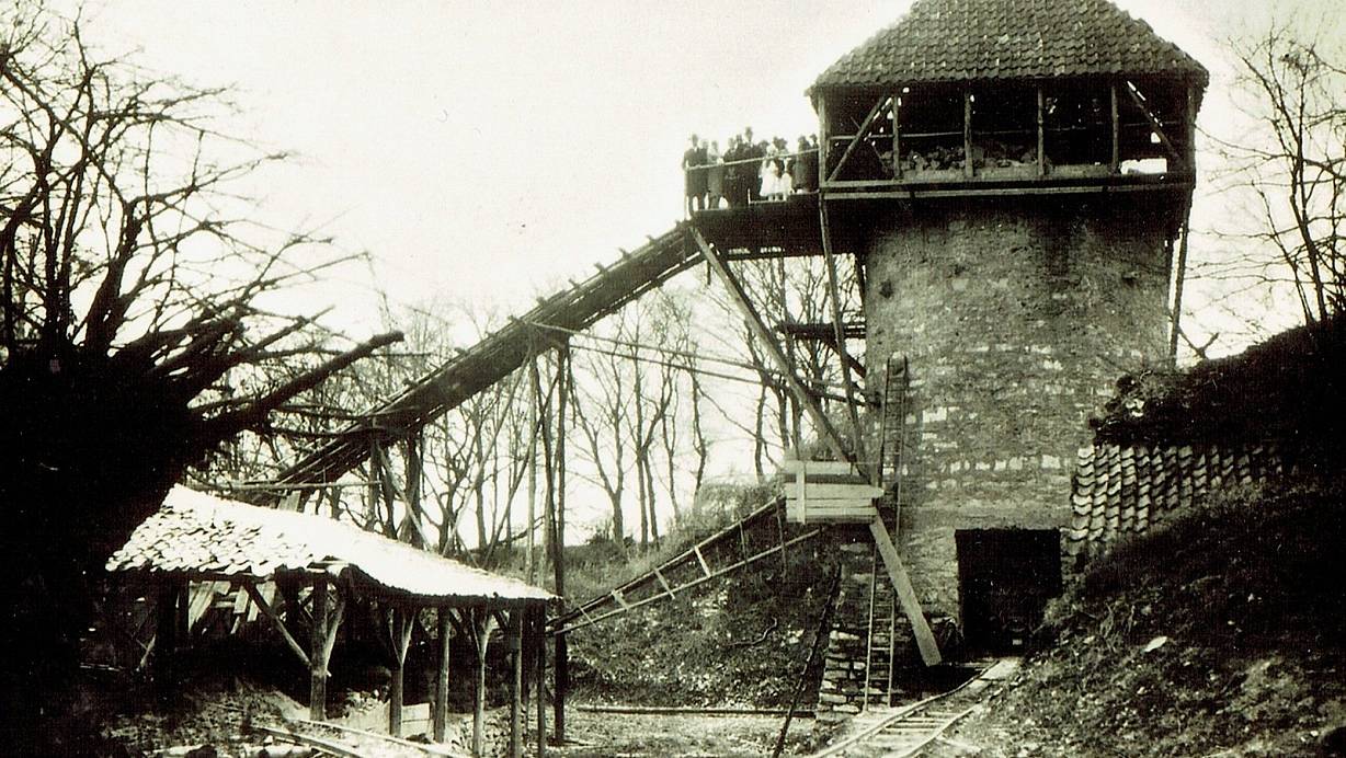 Diese Aufnahme zeigt den Kalkofen der Familie Jürgens in Bosenholz. Schienen dienten für den Transport des Materials. | © Repro: Schulte