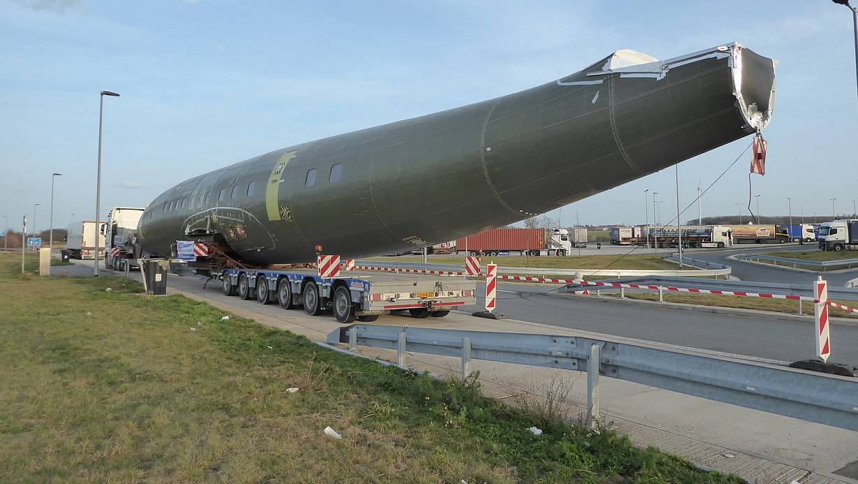 Der Rumpf der Super Constellation auf dem Tieflader eines Schwertransports am A-44-Rastplatz Hellweg Süd zwischen Steinhausen und Eringerfeld. | © Dean Raineri/DLBS