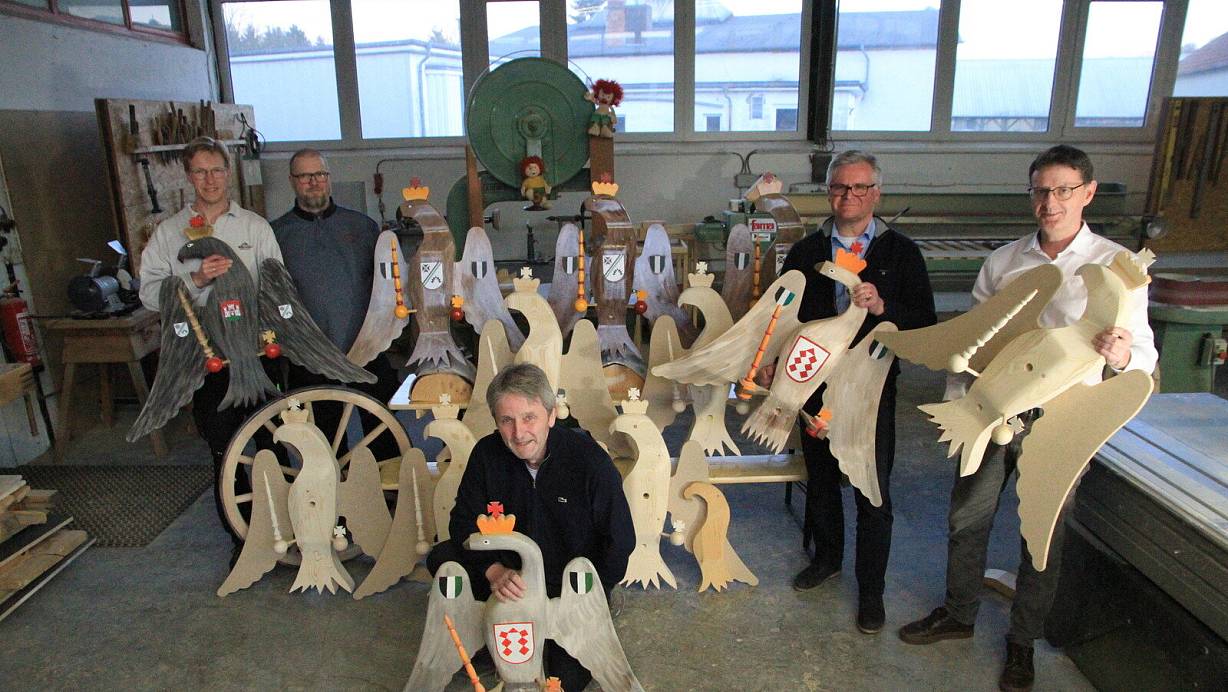 Von den 40 Bestellungen, die in seinem Auftragsbuch stehen, hat er bereits 18 fertiggestellt. „Holztechnisch sind die Vögel, die zumeist aus Fichtenholz hergestellt werden, fertig. Was noch fehlt, ist der Anstrich“, sagt Vogelmacher Vogt. Dass die Holzadler noch nicht ihr Farbenkleid haben, hat aber einen besonderen Grund.