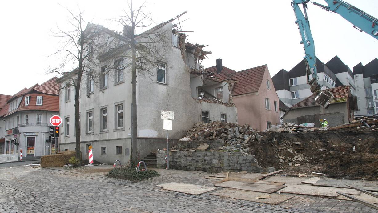 Die König- und Burgstraße sind noch bis Sonntag gesperrt. „Nachdem die letzten Schulbusse durch waren, haben wir die Straßensperrungen durchgeführt“, sagte Sven Hein, Geschäftsführer der Bürener Ingenieurgesellschaft. Nach dem Abriss des Gebäudes soll hier die Straßenführung verbreitert werden, um vor allem den Begegnungsverkehr von großen Fahrzeugen im Bereich Königstraße/Bertholdstraße zu verbessern.