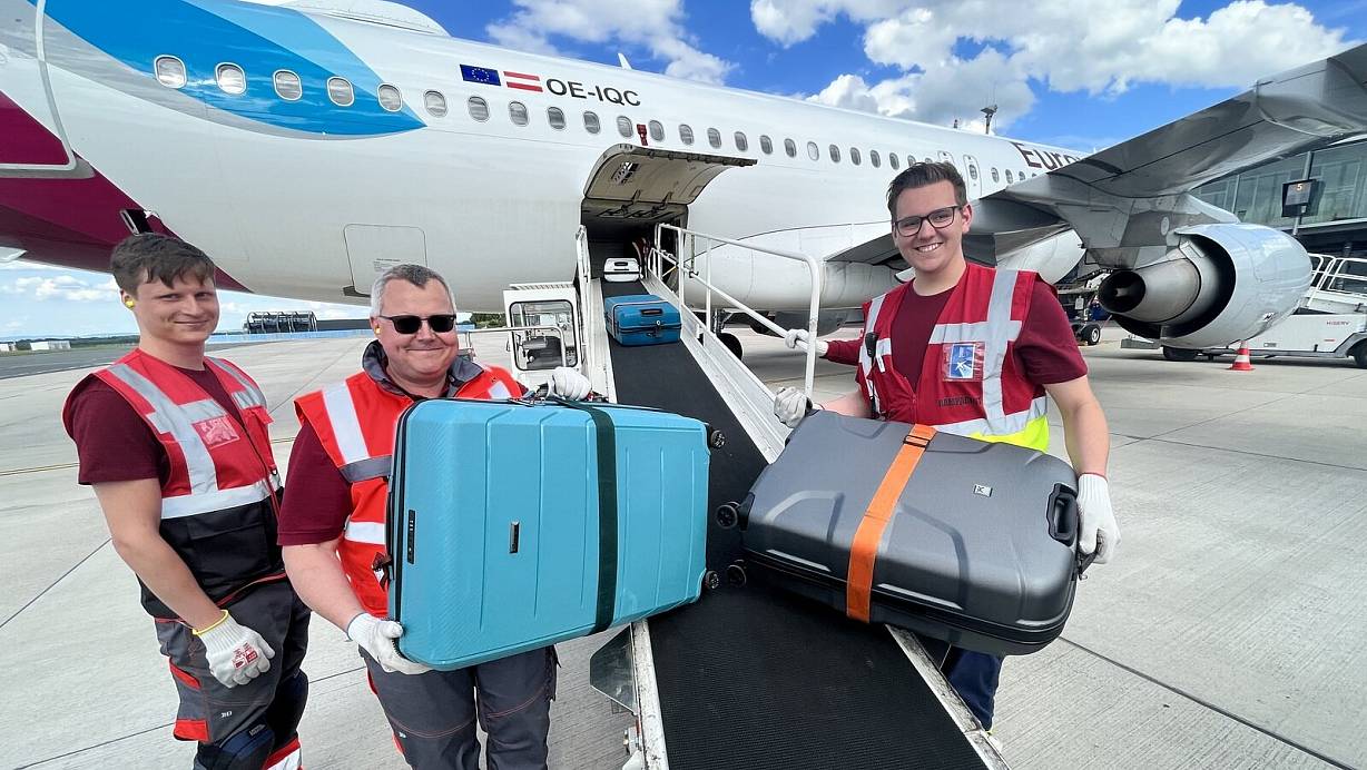 Kräftig anpacken können André Spottke (v. l.), Michael Koch und Jan Kellner. Sie wuchten Koffer aus dem Airbus A319, bevor die neuen eingeladen werden. | © Jens Reddeker