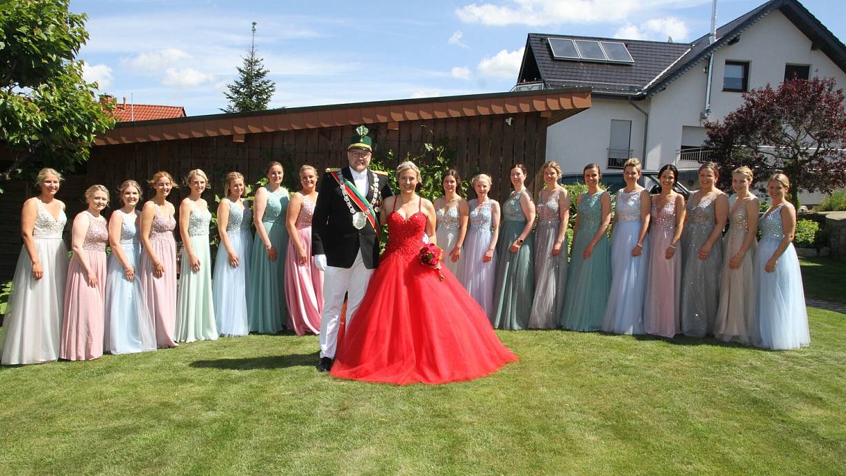 Besonders hervor hob sich natürlich die Königsresidenz. Bereits ab Donnerstag hatten viele Helfer dort alles geschmückt. Aber das Königshaus bildete nur den Rahmen, das Hauptaugenmerk fiel natürlich auf das Königspaar und ihrem Gefolge. Königin Alina, 26 Jahre jung und von Beruf Finanzbeamtin, trug ein rotes Traumkleid. Begleitet von ihrem stolzen König Denis (27), schritt das Königspaar die Spalier bildenden Reihen der Schützen und Musiker mit einem königlichen Lächeln ab. Darunter war auch der Musikverein Steinhausen, wo Alina Vollmer Saxophonistin ist.