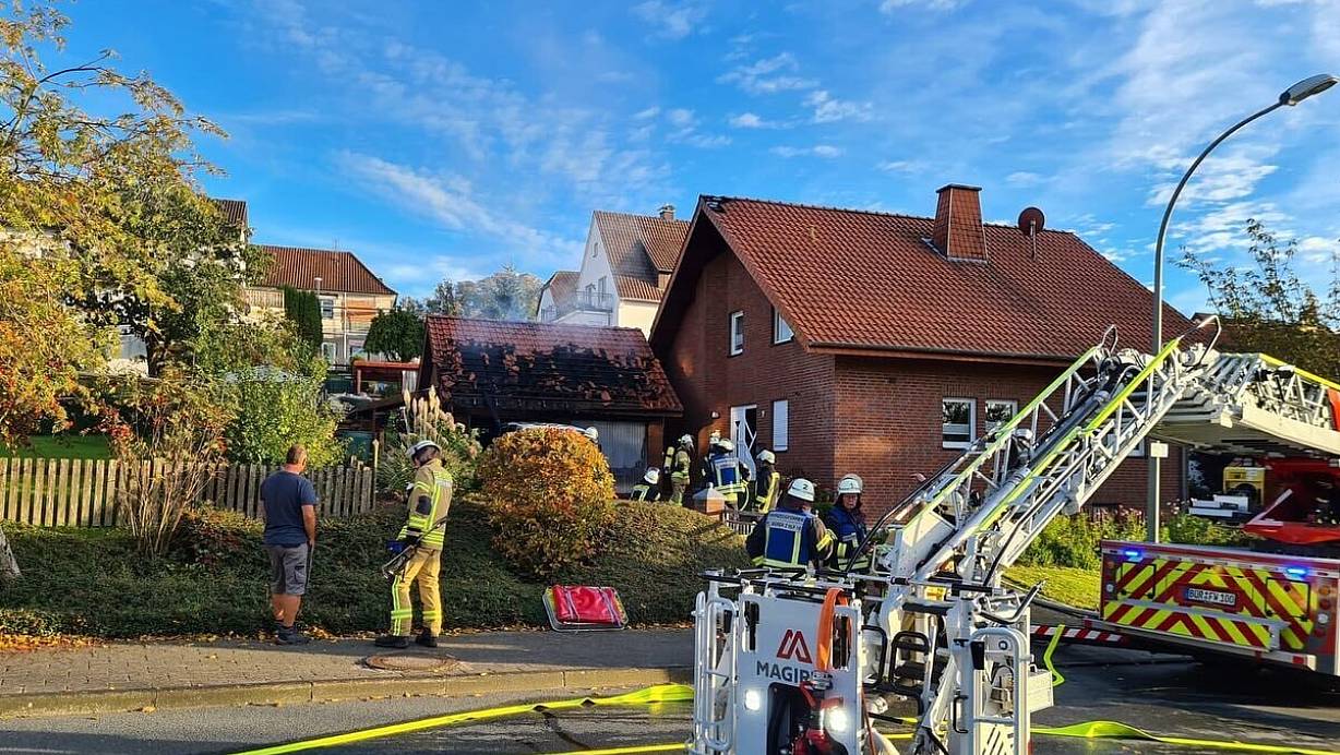 Gegen 17 Uhr hatten die Hausbewohner an der Straße Hohlensiepen bemerkt, dass Flammen aus der freistehenden Garage schlugen. Sie alarmierten umgehend die Feuerwehr, die mit den Einheiten aus Weiberg, Harth, Hegensdorf und Büren ausrückte. Beim Eintreffen der Einsatzkräfte hatte das Feuer bereits auf zwei vor den Garagentoren stehende Fahrzeuge übergegriffen. Ein VW Bulli brannte vollständig aus, ein Skoda wurde im Frontbereich stark beschädigt.