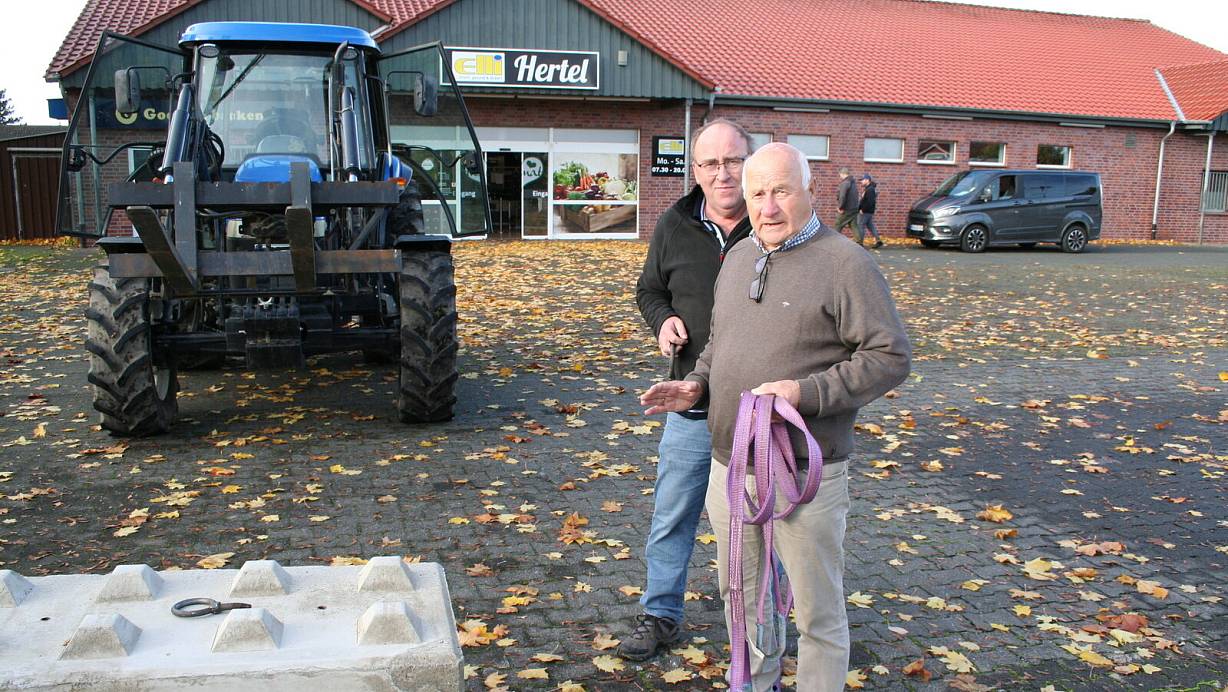 Der Gebäudeeigentümer Wassmuth hatte die Zufahrt blockiert, um ein Ausräumen zu verhindern. Nachdem man sich einigte, wurde die Zufahrt von Ortsvorsteher Günter Eggebrecht (l.) und Immobilienbesitzer Gerhard Wassmuth freigegeben. | © Johannes Büttner