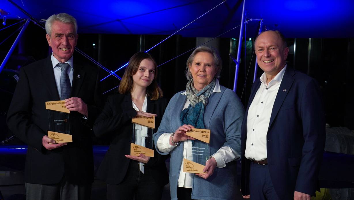 Als Höhepunkt der Veranstaltung wurden die Ehrenamtspreise an die diesjährigen Preisträger verliehen. Christoph Rüther überreichte jeweils einen Pokal und eine Ehrenurkunde an Silvia Jäger für den Ambulanten Kinder- und Jugendhospizdienst Paderborn-Höxter, Fritz Deneke aus Büren und an Antonia Sausner für [U25] Suizidprävention Paderborn. „Sie werden heute für unterschiedliches Engagement geehrt. Sie eint jedoch der vorbildliche Einsatz für Ihre Mitmenschen und die Gemeinschaft. Sie leisten damit einen sehr wertvollen Beitrag für die Gesellschaft, für den ich Ihnen herzlich danke“, hob Rüther hervor. Alle drei Ausgezeichneten erhalten zudem jeweils einen Betrag in Höhe von 1.000 Euro.